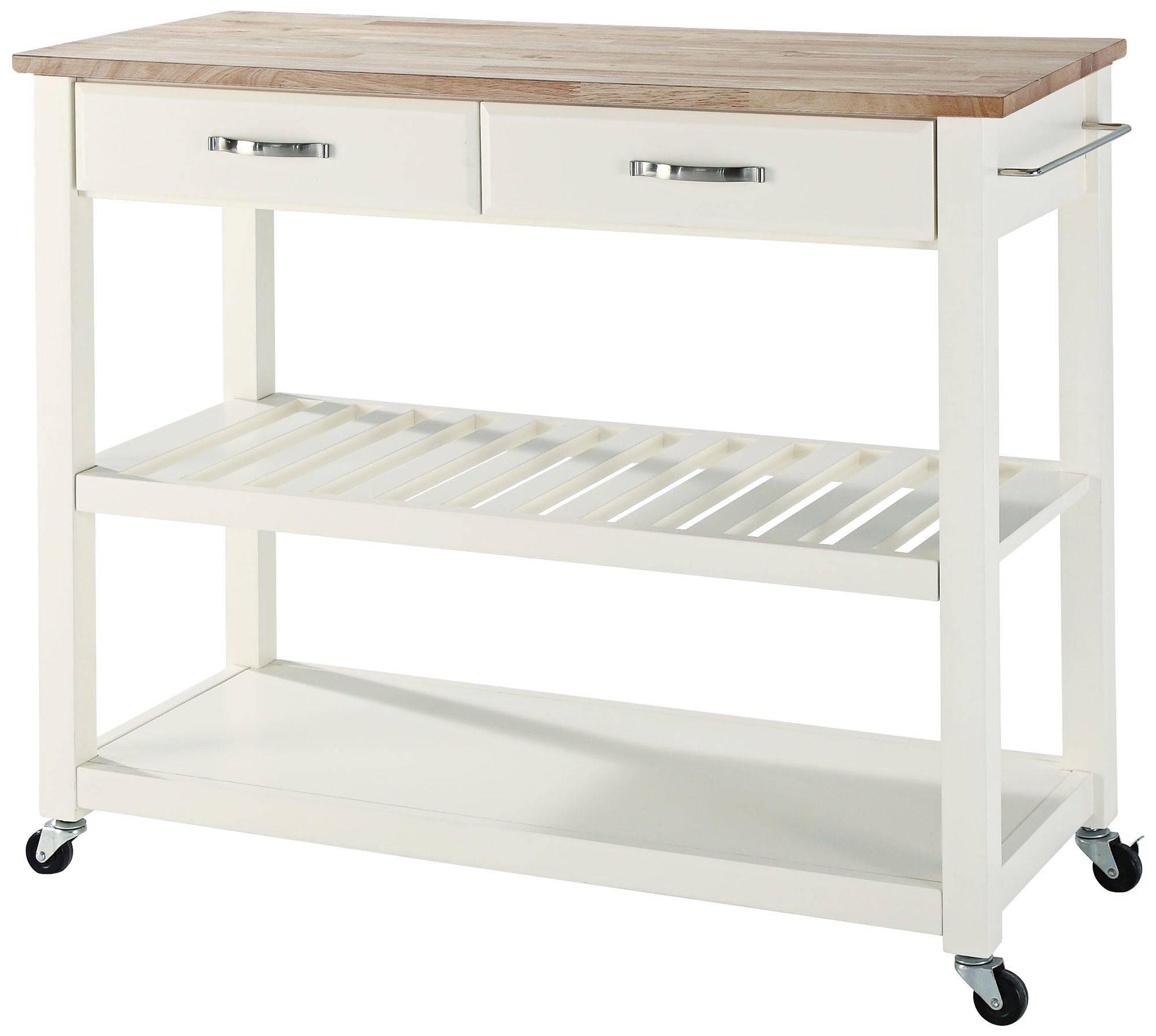 The stylish white finish and natural wood top make this cart an adorable addition to any decor schemes. The sitara kitchen cart adds storage space and charm to your kitchen with this wheeled cart. Kitchens contain lots of instant things. This contemporary kitchen island cart features ample storage for all your cooking needs with shelves and two basket racks.